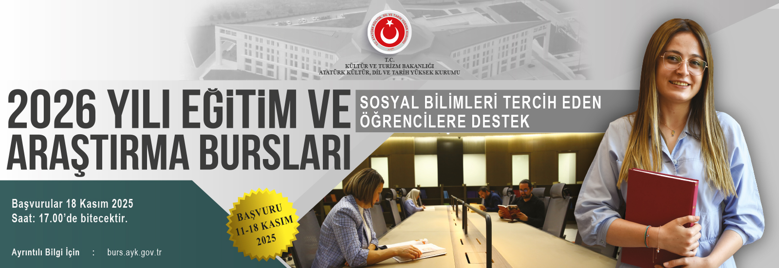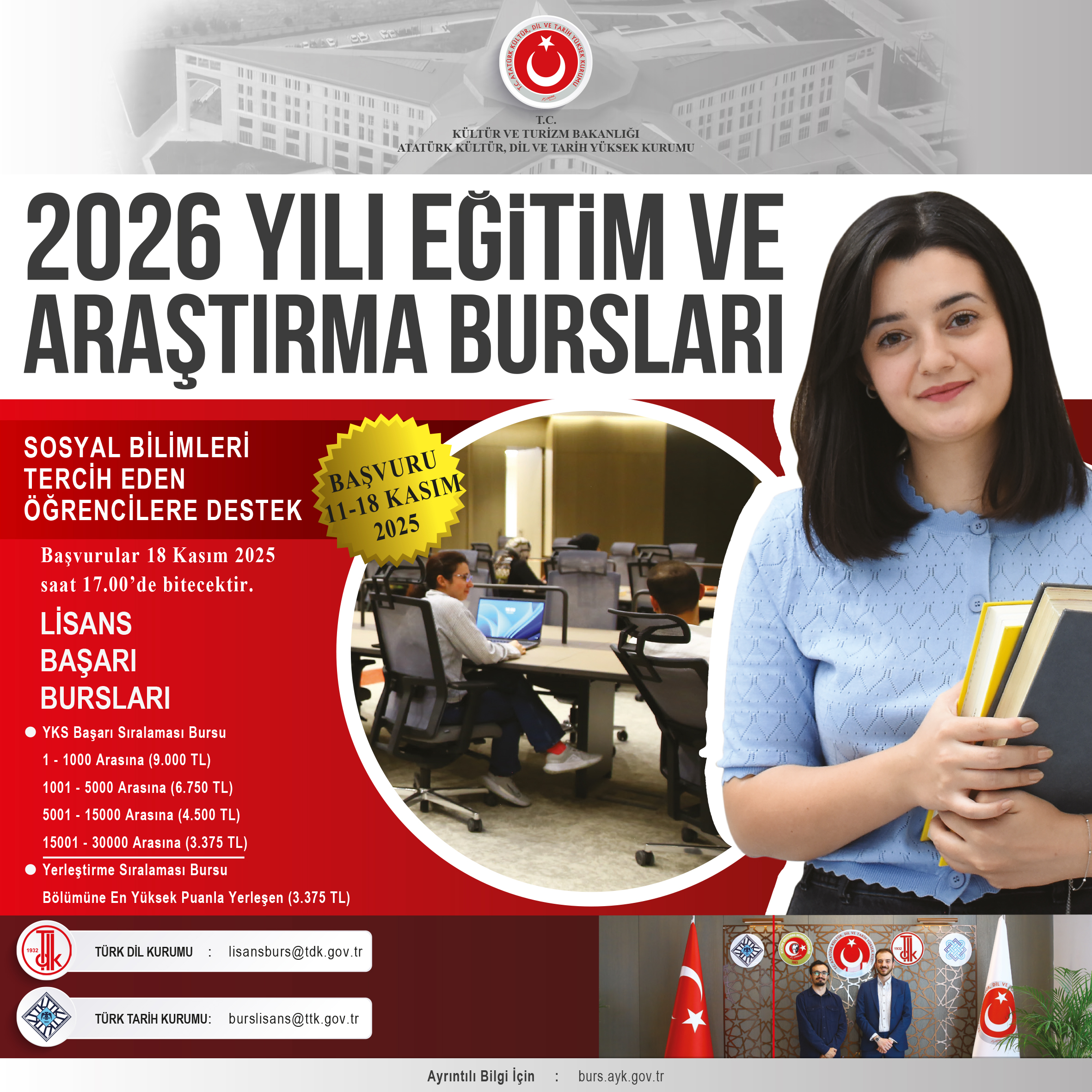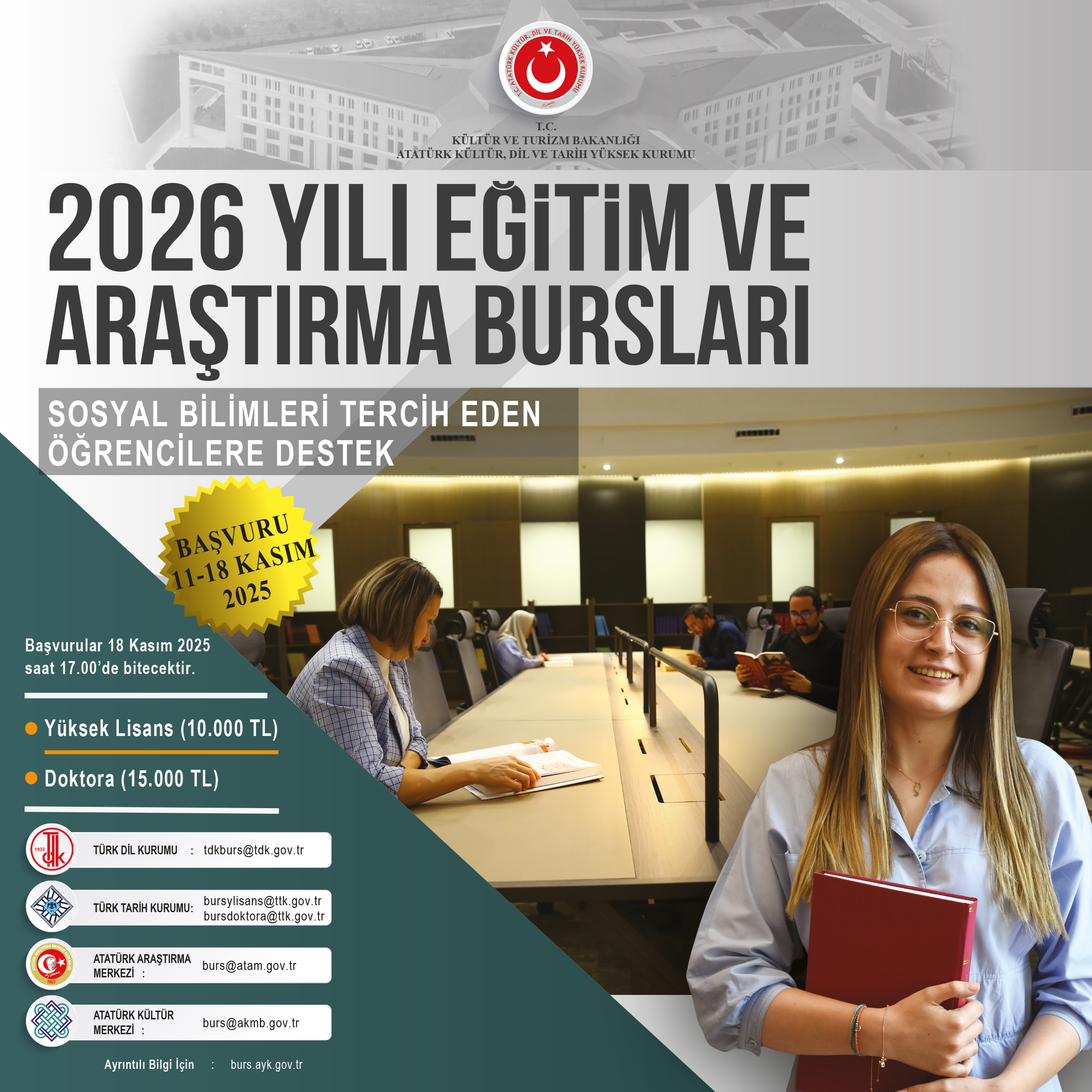 Kurumumuz bünyesinde yer alan Atatürk Araştırma Merkezi, Türk Dil Kurumu, Türk Tarih Kurumu ve Atatürk Kültür Merkezi tarafından 2026 yılı Ocak ayı itibarıyla verilecek olan yurt içi eğitim bursları için başvurular 11-18 Kasım 2025 tarihleri arasında alınacak ve 18 Kasım 2025 Salı günü Türkiye saati ile 17.00’de sona erecektir.