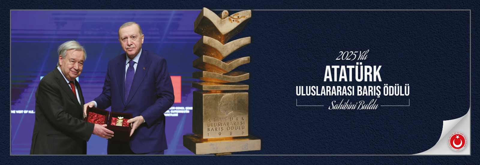 Gazi Mustafa Kemal Atatürk’ün “Yurtta sulh, cihanda sulh” ilkesi doğrultusunda dünya barışına, uluslararası dostluk ve iyi niyetin geliştirilmesine hizmet eden gerçek ve tüzel kişilere Devlet Ödülü niteliğinde verilen Atatürk Uluslararası Barış Ödülü Cumhurbaşkanlığı Külliyesi’nde düzenlenen tören ile Sayın Cumhurbaşkanımız Recep Tayyip Erdoğan tarafından Birleşmiş Milletler Genel Sekreteri Sayın António Guterres’e takdim edildi.